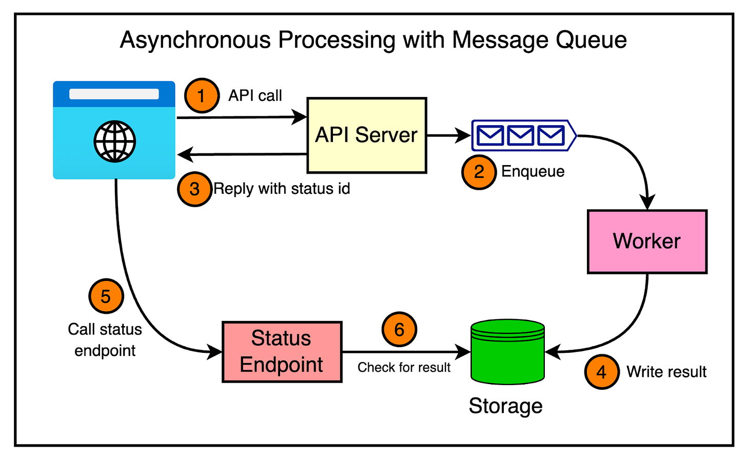 - The API receives the request, validates the input, and enqueues a message representing the task into a message queue.