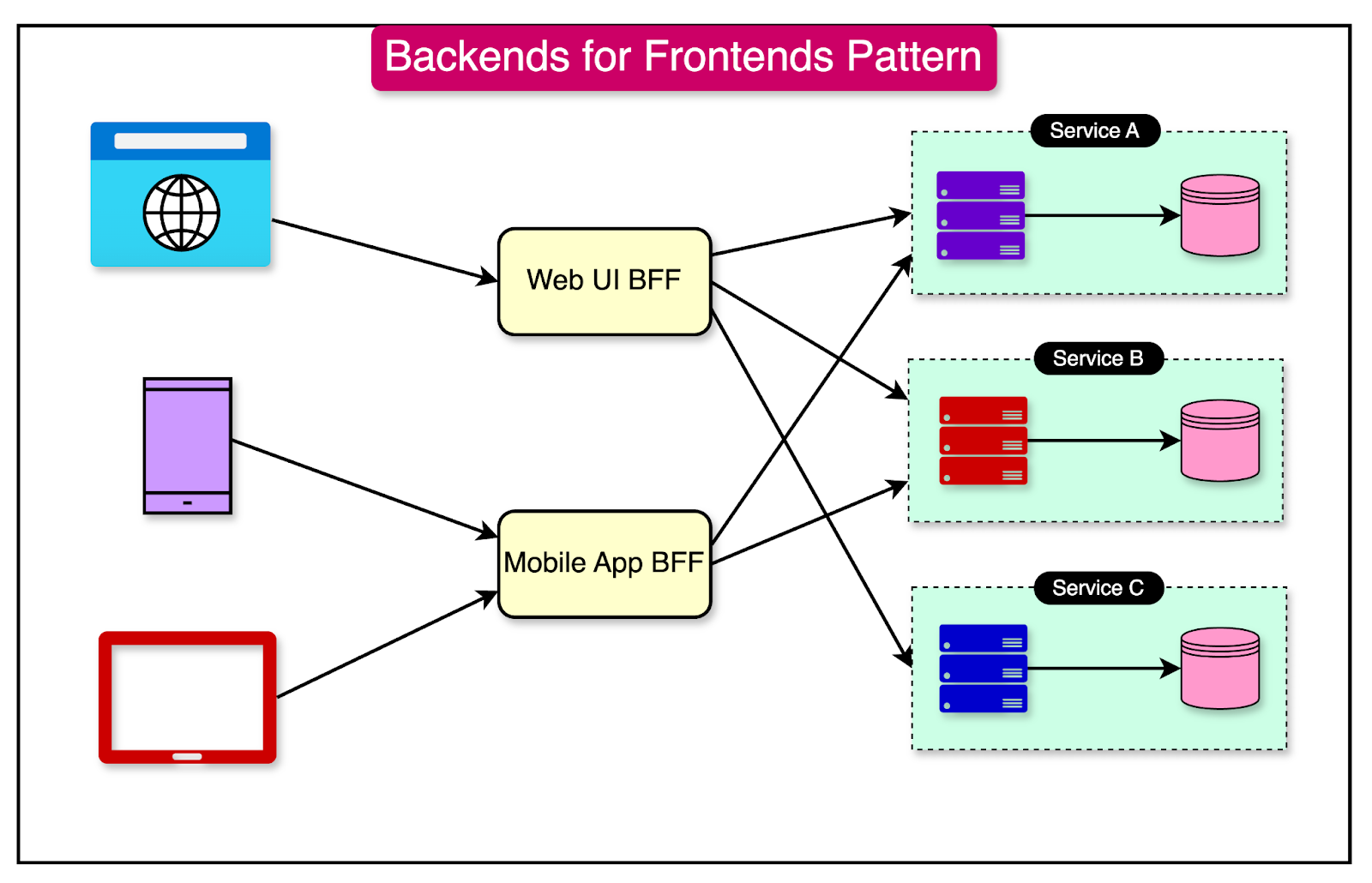 The BFF pattern proposes creating separate backend services tailored specifically for each front-end client. In other words, each user interface (UI) gets a dedicated backend designed exclusively to cater to its unique requirements.